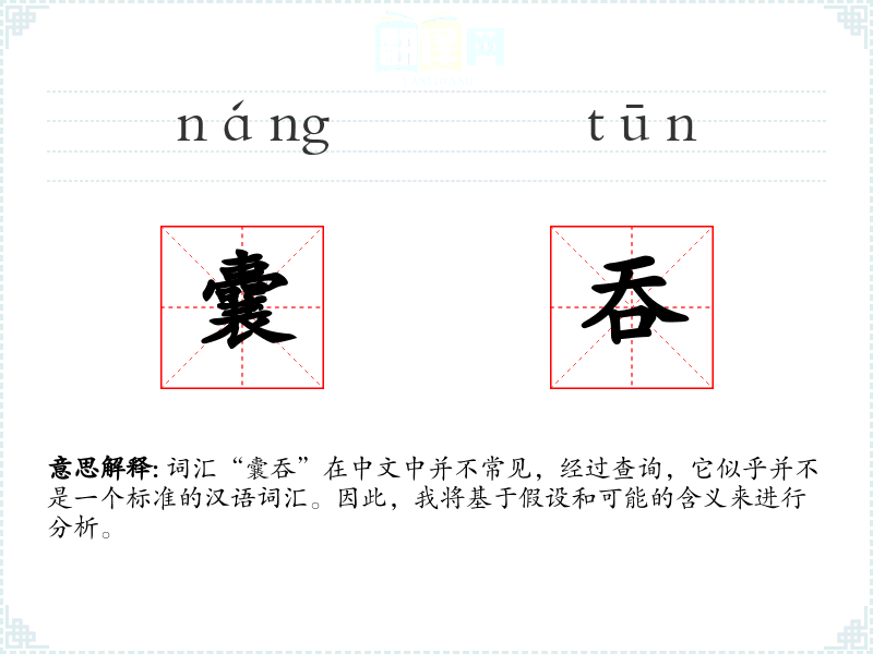 词汇“囊吞”在中文中并不常见,经过查询,它似乎并不是一个标准的汉语词汇。因此,我将基于假设和可能的含义来进行分析。