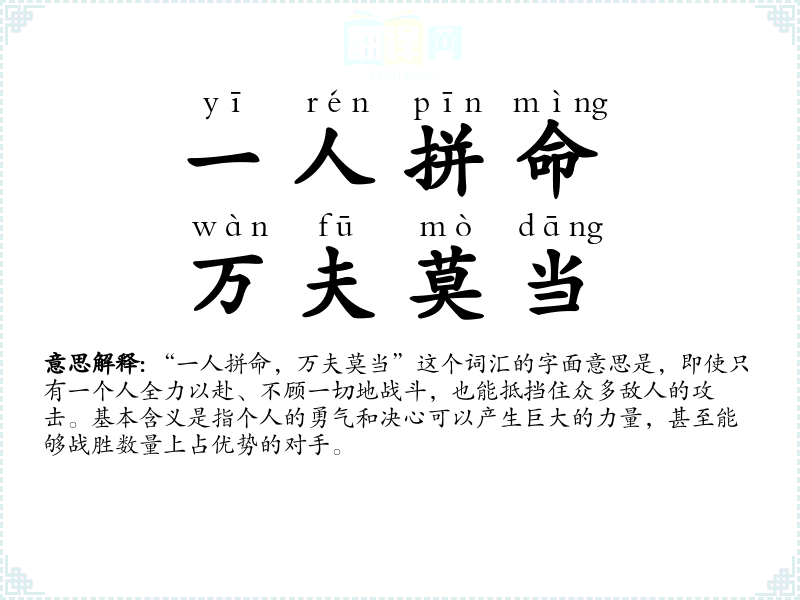 “一人拼命,万夫莫当”这个词汇的字面意思是,即使只有一个人全力以赴、不顾一切地战斗,也能抵挡住众多敌人的攻击。基本含义是指个人的勇气和决心可以产生巨大的力量,甚至能够战胜数量上占优势的对手。