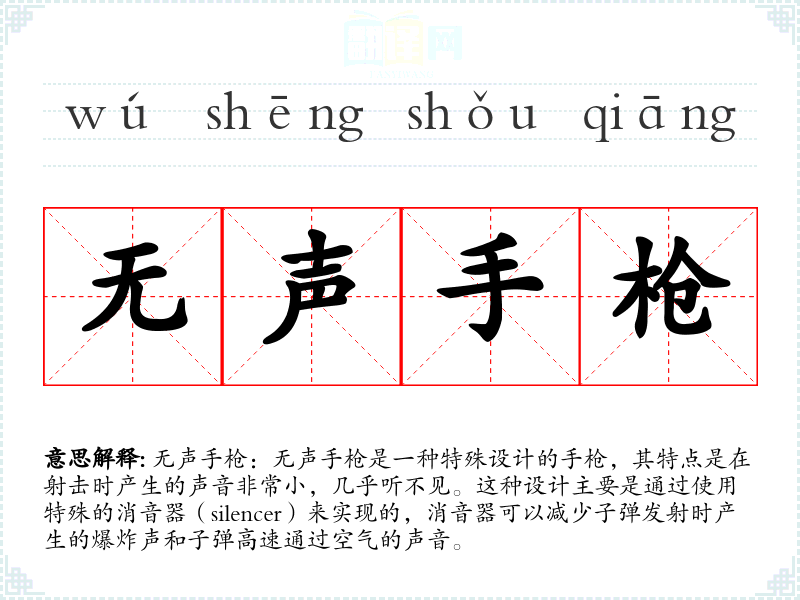 - 反义词:响亮手枪(虽然这个词汇不常用,但可以理解为指那些射击声音很大的手枪)