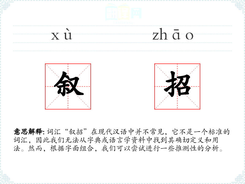 词汇“叙招”在现代汉语中并不常见,它不是一个标准的词汇,因此我们无法从字典或语言学资料中找到其确切定义和用法。然而,根据字面组合,我们可以尝试进行一些推测性的分析。
