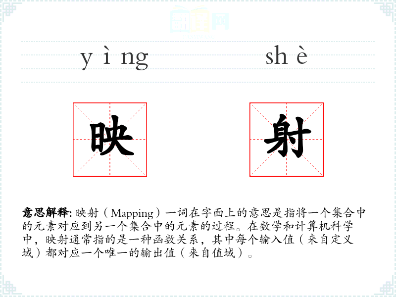 “映射”一词源自英语单词“map”,最初指的是地图,后来扩展到数学和计算机科学中的函数关系。在中文中,“映射”一词的使用也随着这些领域的发展而逐渐普及。