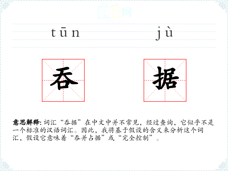 词汇“吞据”在中文中并不常见,经过查询,它似乎不是一个标准的汉语词汇。因此,我将基于假设的含义来分析这个词汇,假设它意味着“吞并占据”或“完全控制”。