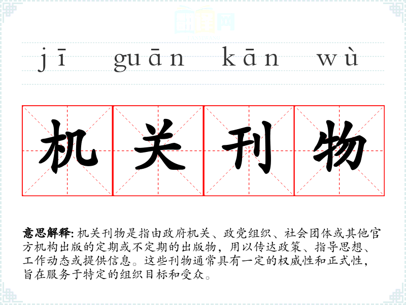 在不同语言或文化中,机关刊物的对应词汇可能有所不同,但其核心含义——官方出版物——是普遍存在的。例如,在英语中,类似的词汇可能是“official publication”或“government journal”。
