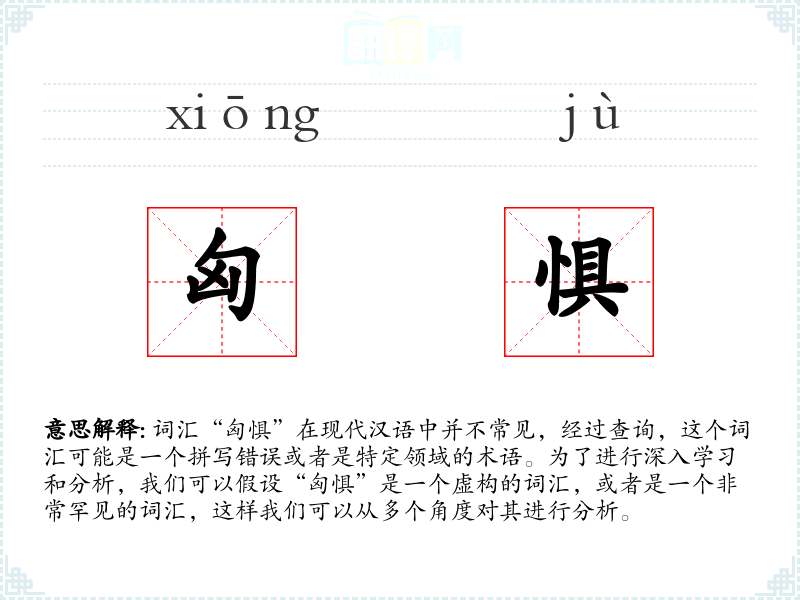 词汇“匈惧”在现代汉语中并不常见,经过查询,这个词汇可能是一个拼写错误或者是特定领域的术语。为了进行深入学习和分析,我们可以假设“匈惧”是一个虚构的词汇,或者是一个非常罕见的词汇,这样我们可以从多个角度对其进行分析。
