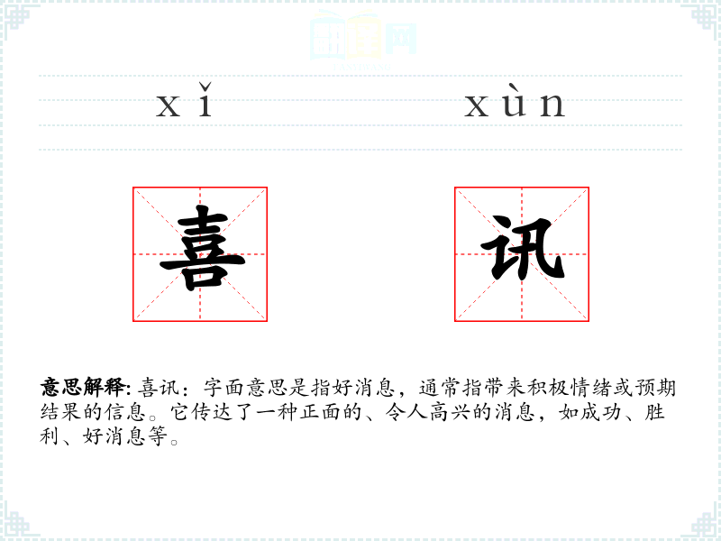 喜讯:字面意思是指好消息,通常指带来积极情绪或预期结果的信息。它传达了一种正面的、令人高兴的消息,如成功、胜利、好消息等。