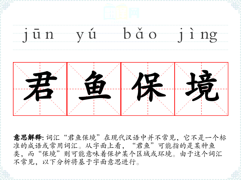 词汇“君鱼保境”在现代汉语中并不常见,它不是一个标准的成语或常用词汇。从字面上看,“君鱼”可能指的是某种鱼类,而“保境”则可能意味着保护某个区域或环境。由于这个词汇不常见,以下分析将基于字面意思进行。