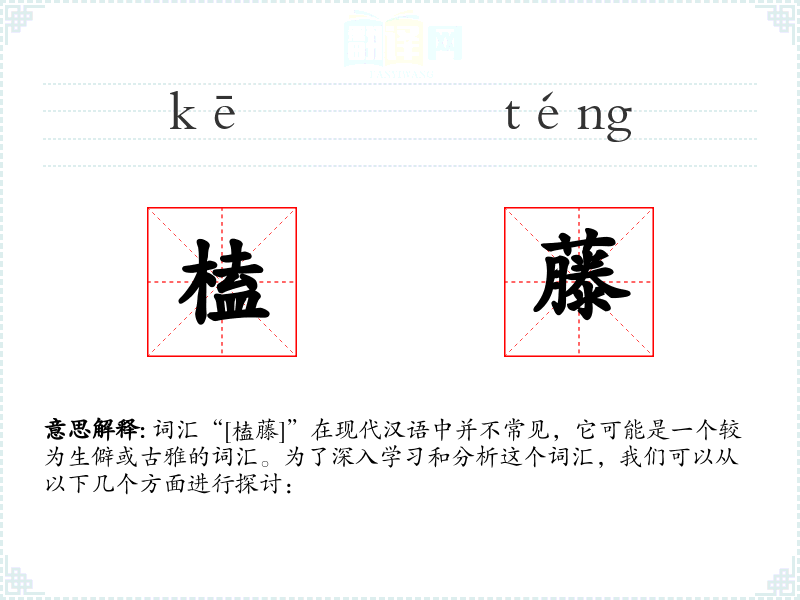 通过对“榼藤”的学习和分析,我们可以了解到它在古代文化中的用途和意义,以及它在现代语言中的生僻性。这个词汇虽然不常见,但它反映了语言的丰富性和历史的深度,对于语言学习和文化研究具有一定的价值。