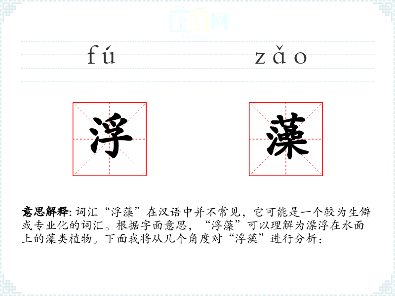 “浮藻”由“浮”和“藻”两个字组成。“浮”字表示漂浮,而“藻”字指的是水生植物。这个词汇可能没有显著的历史演变,它更多是一个描述性的生物学术语。