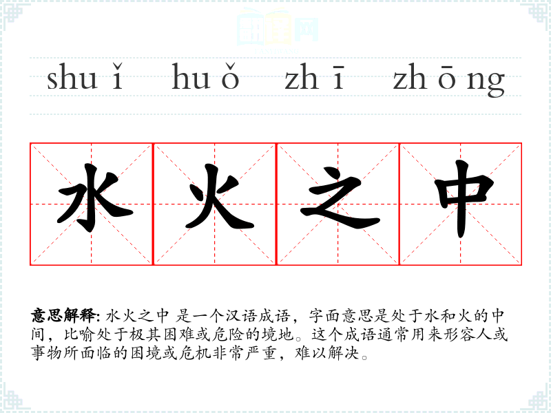 水火之中 是一个汉语成语,字面意思是处于水和火的中间,比喻处于极其困难或危险的境地。这个成语通常用来形容人或事物所面临的困境或危机非常严重,难以解决。