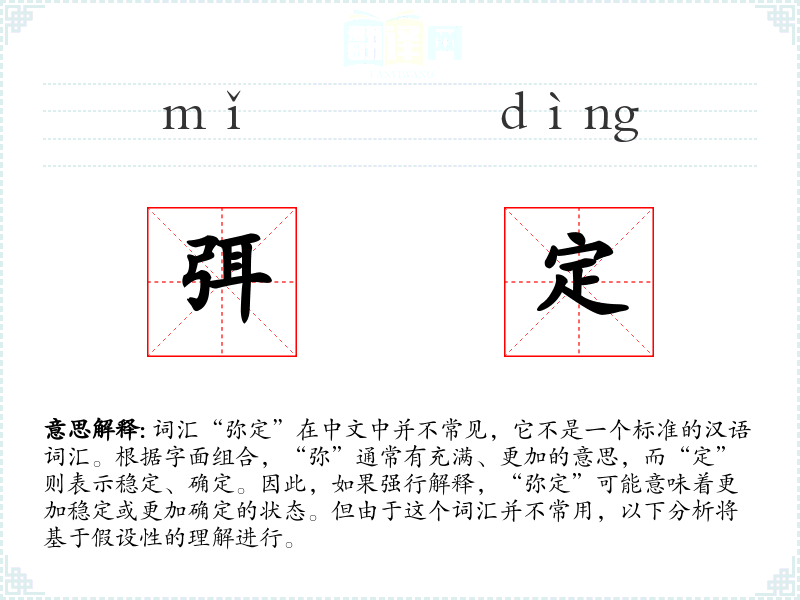 词汇“弥定”在中文中并不常见,它不是一个标准的汉语词汇。根据字面组合,“弥”通常有充满、更加的意思,而“定”则表示稳定、确定。因此,如果强行解释,“弥定”可能意味着更加稳定或更加确定的状态。但由于这个词汇并不常用,以下分析将基于假设性的理解进行。