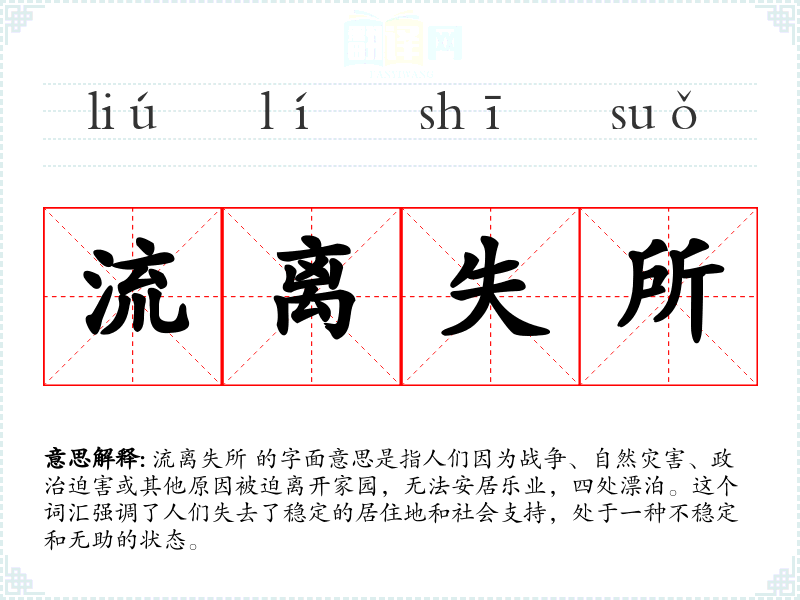 在特定的文化或社会背景中,“流离失所”可能与特定的历史**或社会问题相关联,如战争、种族清洗或经济危机。这些背景加深了人们对这个词的理解和情感反应。