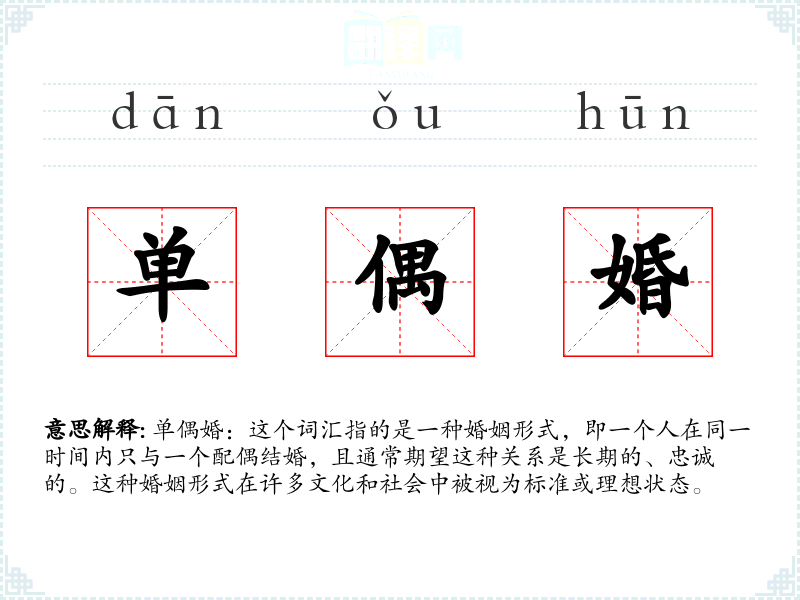 单偶婚:这个词汇指的是一种婚姻形式,即一个人在同一时间内只与一个配偶结婚,且通常期望这种关系是长期的、忠诚的。这种婚姻形式在许多文化和社会中被视为标准或理想状态。