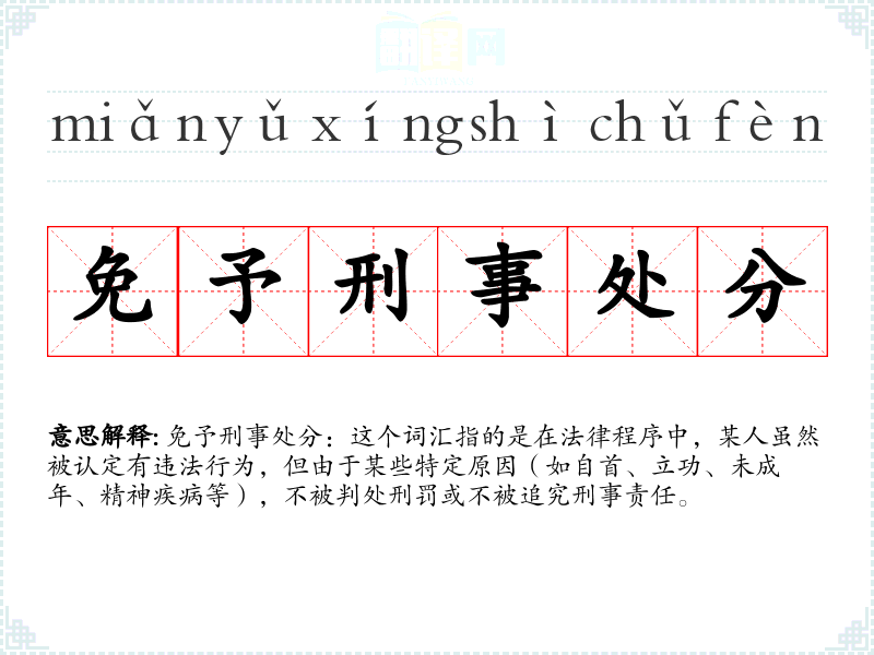 免予刑事处分:这个词汇指的是在法律程序中,某人虽然被认定有违法行为,但由于某些特定原因(如自首、立功、未成年、精神疾病等),不被判处刑罚或不被追究刑事责任。