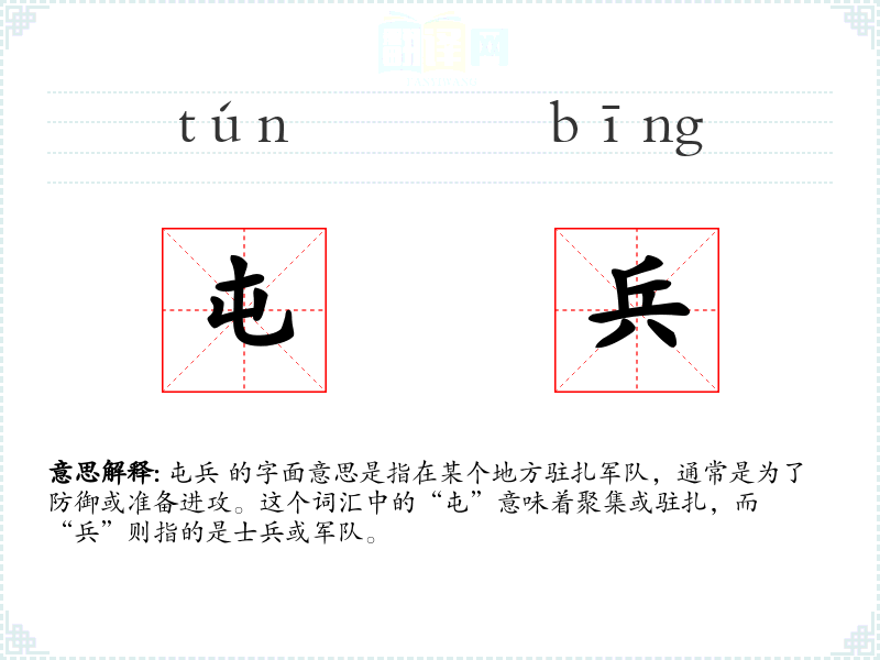 屯兵 的字面意思是指在某个地方驻扎军队,通常是为了防御或准备进攻。这个词汇中的“屯”意味着聚集或驻扎,而“兵”则指的是士兵或军队。