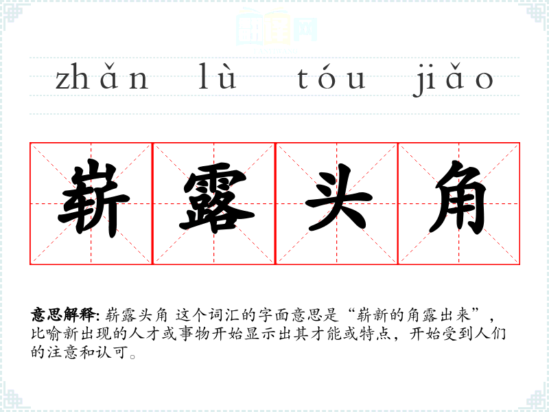 崭露头角 这个词汇的字面意思是“崭新的角露出来”,比喻新出现的人才或事物开始显示出其才能或特点,开始受到人们的注意和认可。