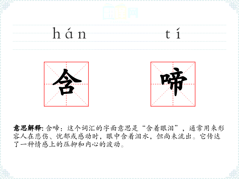 “含啼”这个词汇在中文里有着悠久的历史,其字面组合“含”和“啼”分别表示“含着”和“哭泣”,结合起来形成了这个表达情感的词汇。在古代文学中,这个词汇经常被用来描绘人物的内心情感,随着时间的推移,它逐渐成为了一个常用的情感表达词汇。