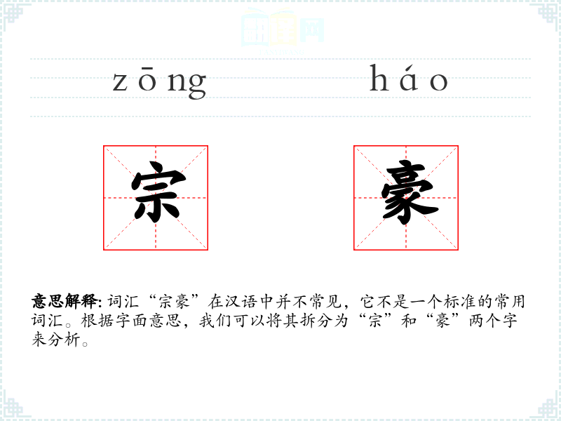 词汇“宗豪”在汉语中并不常见,它不是一个标准的常用词汇。根据字面意思,我们可以将其拆分为“宗”和“豪”两个字来分析。