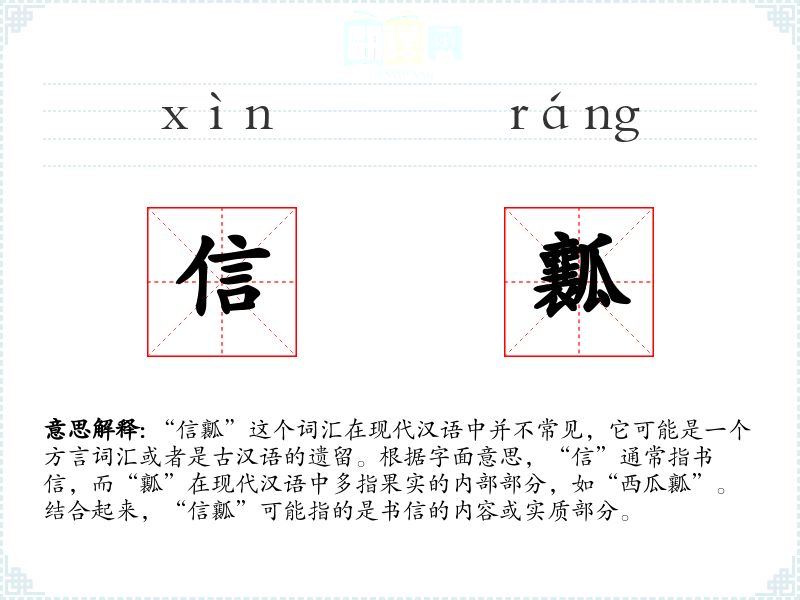 “信瓤”这个词汇在现代汉语中并不常见,它可能是一个方言词汇或者是古汉语的遗留。根据字面意思,“信”通常指书信,而“瓤”在现代汉语中多指果实的内部部分,如“西瓜瓤”。结合起来,“信瓤”可能指的是书信的内容或实质部分。
