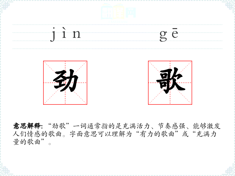 “劲歌”一词通常指的是充满活力、节奏感强、能够激发人们情感的歌曲。字面意思可以理解为“有力的歌曲”或“充满力量的歌曲”。