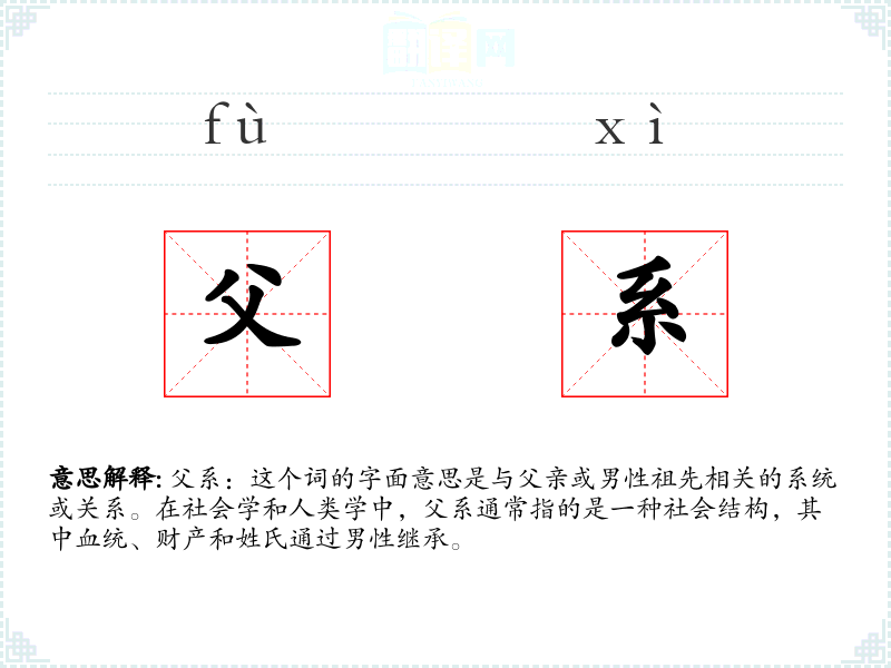 父系:这个词的字面意思是与父亲或男性祖先相关的系统或关系。在社会学和人类学中,父系通常指的是一种社会结构,其中血统、财产和姓氏通过男性继承。
