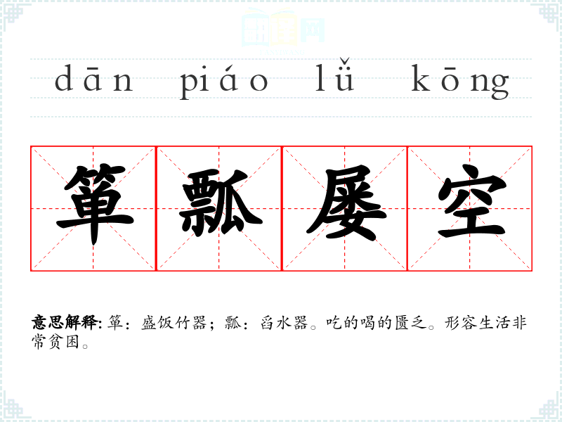 箪:盛饭竹器;瓢:舀水器。吃的喝的匮乏。形容生活非常贫困。