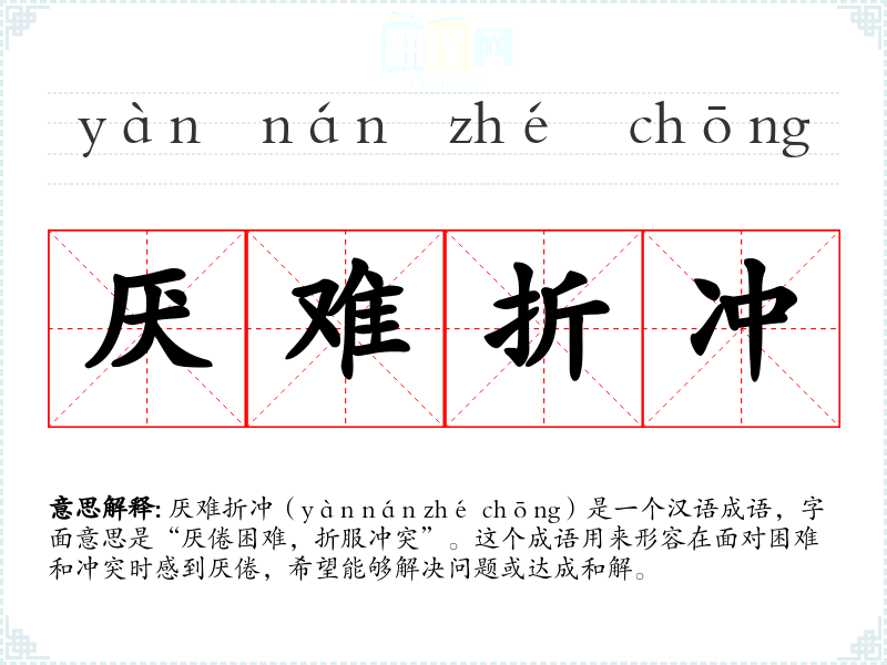 厌难折冲(yàn nán zhé chōng)是一个汉语成语,字面意思是“厌倦困难,折服冲突”。这个成语用来形容在面对困难和冲突时感到厌倦,希望能够解决问题或达成和解。