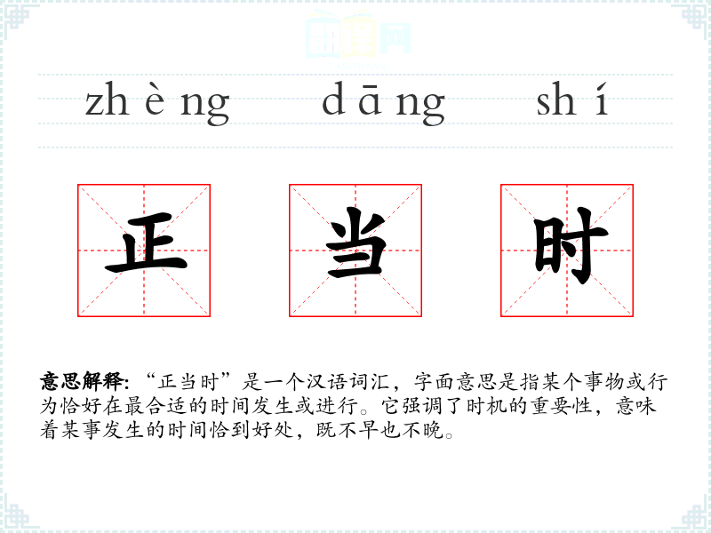 “正当时”是一个汉语词汇,字面意思是指某个事物或行为恰好在最合适的时间发生或进行。它强调了时机的重要性,意味着某事发生的时间恰到好处,既不早也不晚。