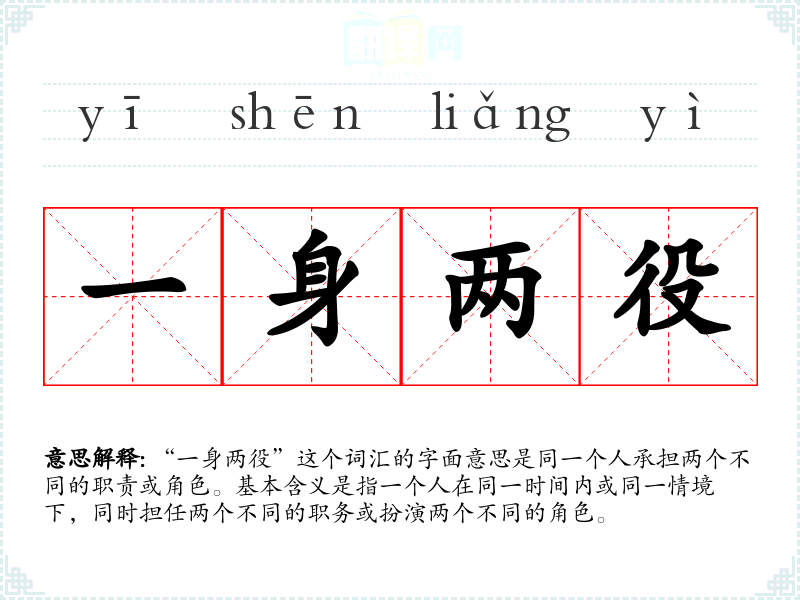 “一身两役”这个词汇的字面意思是同一个人承担两个不同的职责或角色。基本含义是指一个人在同一时间内或同一情境下,同时担任两个不同的职务或扮演两个不同的角色。