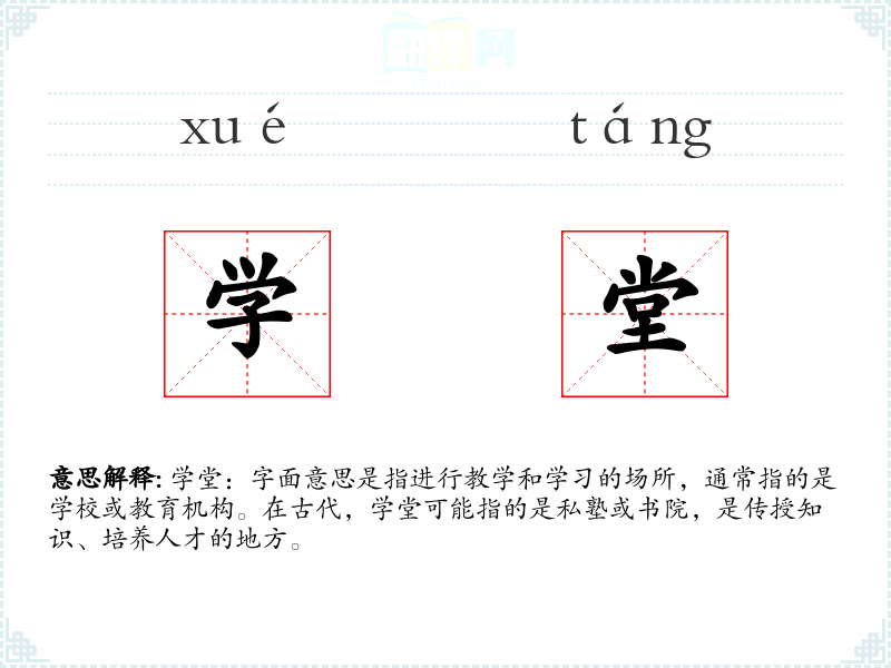 学堂:字面意思是指进行教学和学*的场所,通常指的是学校或教育机构。在古代,学堂可能指的是私塾或书院,是传授知识、培养人才的地方。