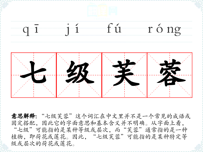 在**文化中,荷花或莲花通常象征着纯洁、高雅和吉祥。如果“七级芙蓉”在某个特定的文化或社会背景中被使用,它可能被赋予了更深层次的象征意义,比如代表某种特别高贵或珍贵的品质。