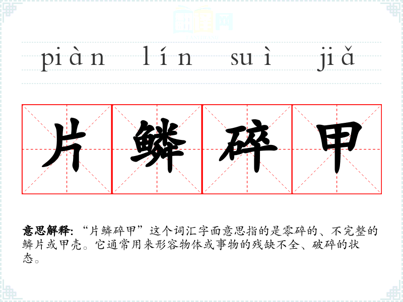 “片鳞碎甲”这个词汇字面意思指的是零碎的、不完整的鳞片或甲壳。它通常用来形容物体或事物的残缺不全、破碎的状态。