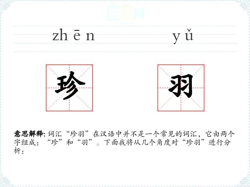 - 词源:“珍”和“羽”都是汉语中的基本词汇,没有特别的词源故事。
