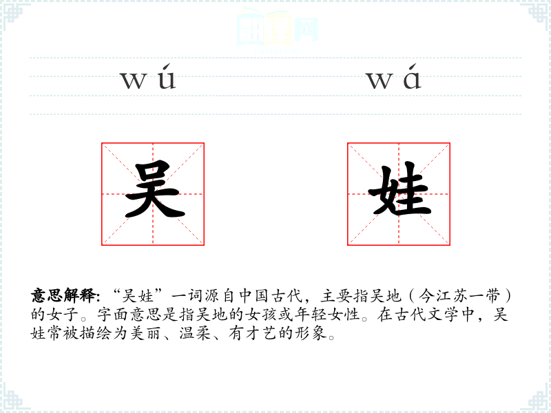 - 文学语境:在古代诗词中,吴娃常被用来形容江南女子的美丽和才情,如“吴娃越艳”、“吴娃双舞醉芙蓉”等。