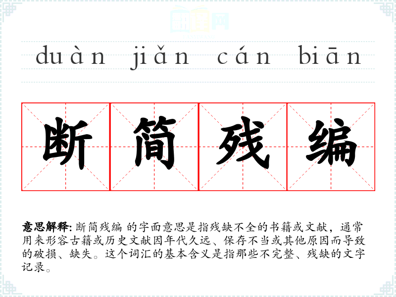 断简残编 这个词汇不仅是一个描述残缺文献的术语,也是一个承载着历史和文化价值的符号。在我的语言学*和表达中,它提醒我要珍惜和尊重历史的每一个片段。