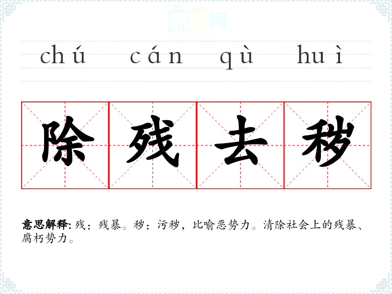 残:残暴。秽:污秽,比喻恶势力。清除社会上的残暴、腐朽势力。