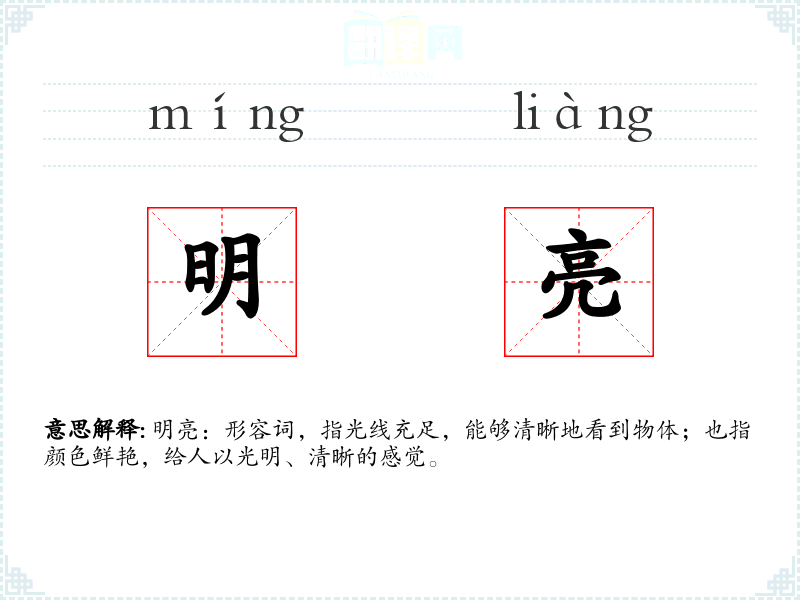 - 词源:“明亮”由“明”和“亮”两个字组成,“明”指光明,“亮”指光线充足。