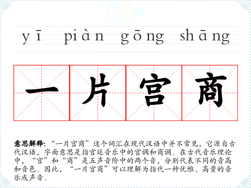 “一片宫商”这个词汇在现代汉语中并不常见,它源自古代汉语,字面意思是指宫廷音乐中的宫调和商调。在古代音乐理论中,“宫”和“商”是五声音阶中的两个音,分别代表不同的音高和音色。因此,“一片宫商”可以理解为指代一种优雅、高贵的音乐或声音。