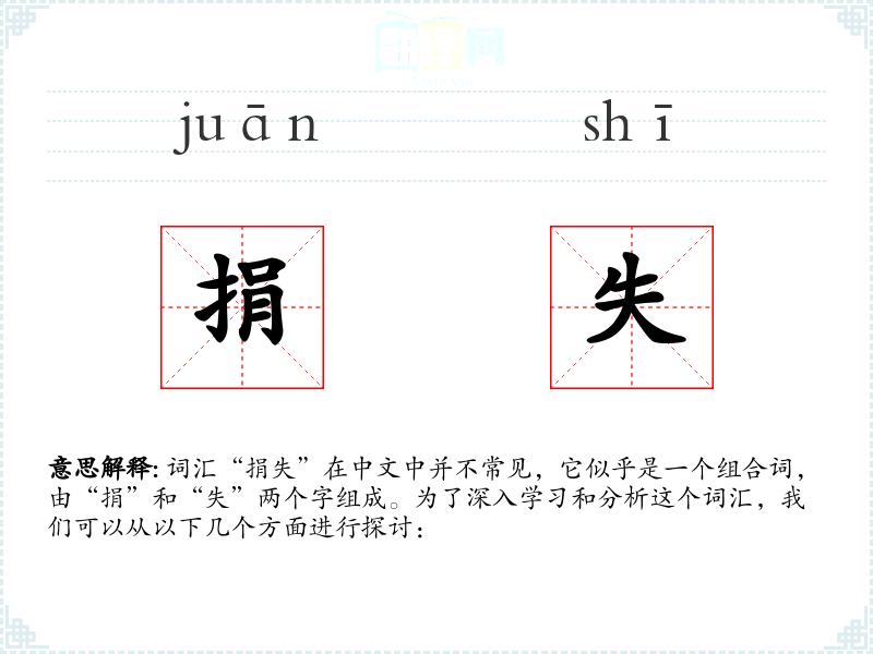 词汇“捐失”在中文中并不常见,它似乎是一个组合词,由“捐”和“失”两个字组成。为了深入学习和分析这个词汇,我们可以从以下几个方面进行探讨: