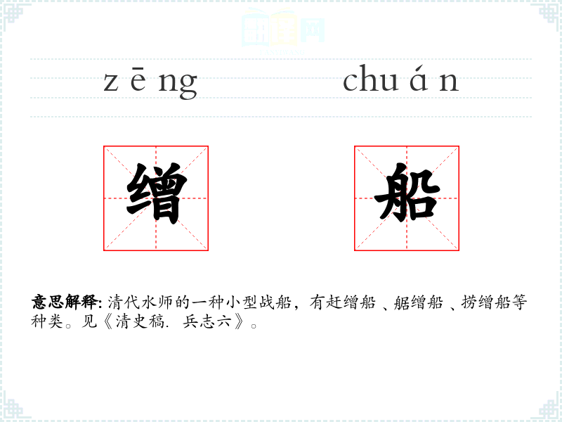 清代水师的一种小型战船,有赶缯船﹑艍缯船﹑捞缯船等种类。见《清史稿.兵志六》。