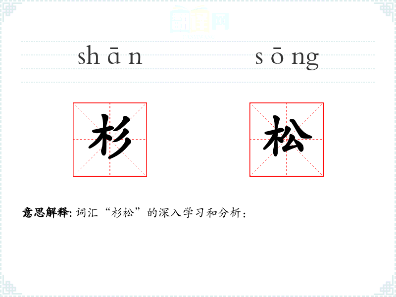 - 反义词:无(因为“杉松”本身是两种树木的合称,不易找到直接的反义词)