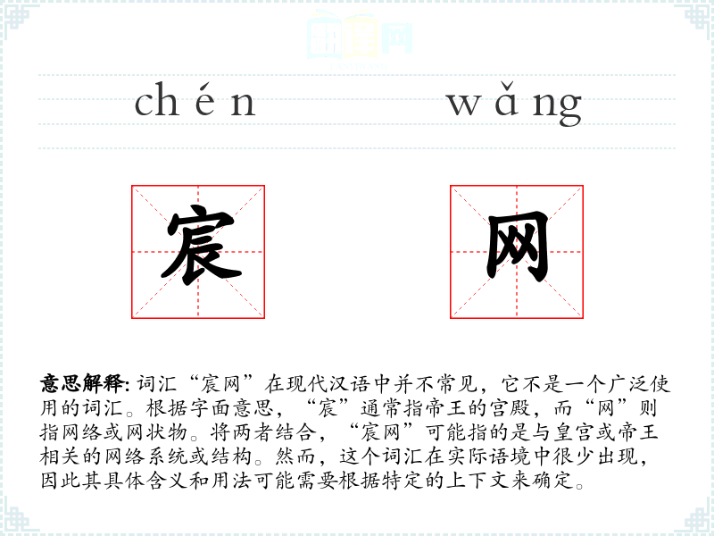 - 词源:“宸”源自古代汉语,指帝王的宫殿;“网”源自古代汉语,指网状物。