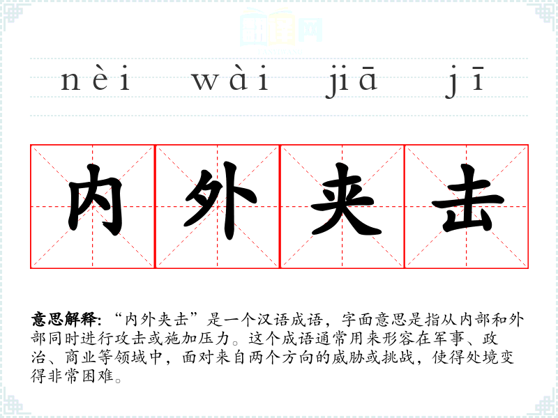 “内外夹击”是一个汉语成语,字面意思是指从内部和外部同时进行攻击或施加压力。这个成语通常用来形容在军事、政治、商业等领域中,面对来自两个方向的威胁或挑战,使得处境变得非常困难。