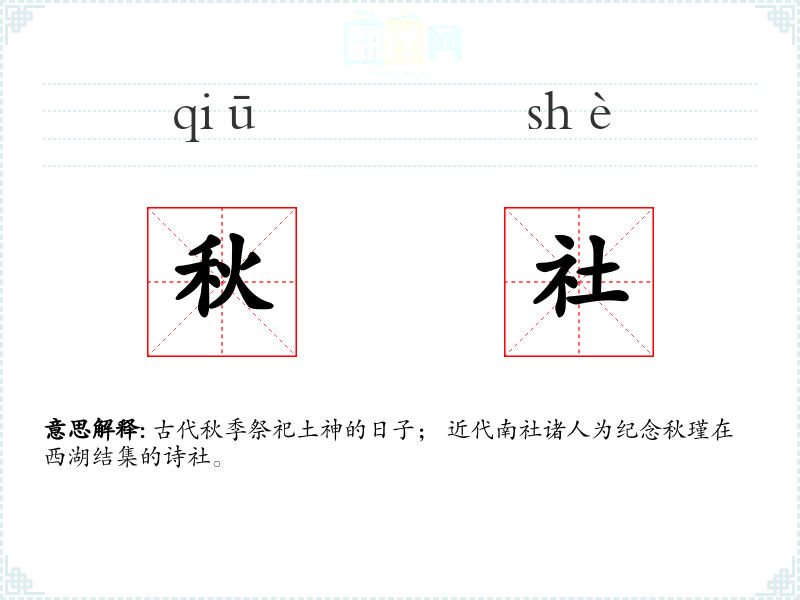 古代秋季祭祀土神的日子; 近代南社诸人为纪念秋瑾在西湖结集的诗社。