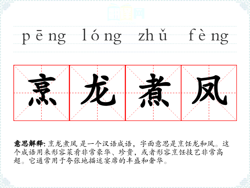 烹龙煮凤 是一个汉语成语,字面意思是烹饪龙和凤。这个成语用来形容菜肴非常豪华、珍贵,或者形容烹饪技艺非常高超。它通常用于夸张地描述宴席的丰盛和奢华。
