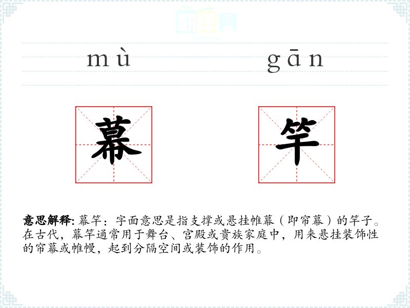 幕竿的词源较为直接,由“幕”和“竿”两个字组成。在古代汉语中,“幕”指帘幕,“竿”指长而直的杆子。随着时间的推移,幕竿的使用逐渐从宫廷和舞台扩展到更广泛的建筑和装饰领域。