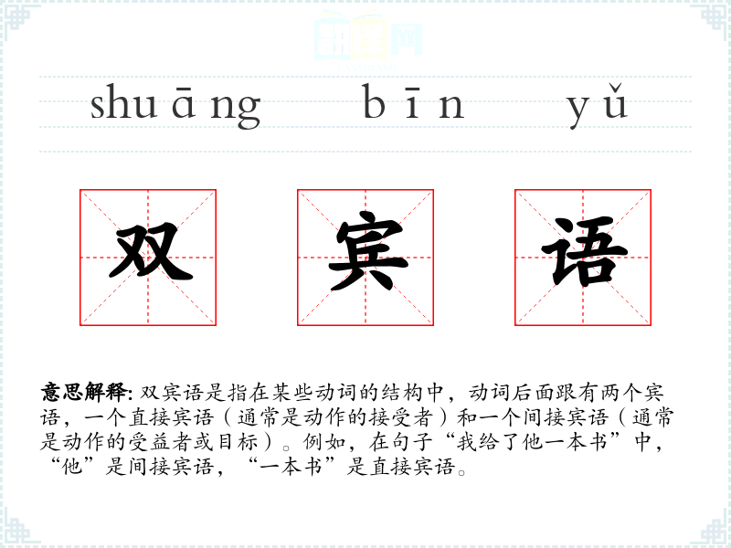 双宾语是指在某些动词的结构中,动词后面跟有两个宾语,一个直接宾语(通常是动作的接受者)和一个间接宾语(通常是动作的受益者或目标)。例如,在句子“我给了他一本书”中,“他”是间接宾语,“一本书”是直接宾语。
