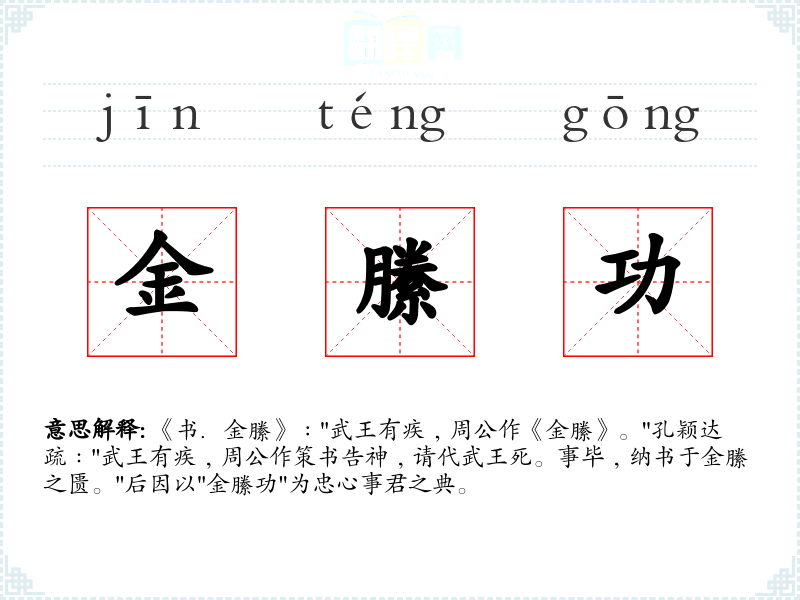 《书.金縢》﹕"武王有疾﹐周公作《金縢》。"孔颖达疏﹕"武王有疾﹐周公作策书告神﹐请代武王死。事毕﹐纳书于金縢之匮。"后因以"金縢功"为忠心事君之典。