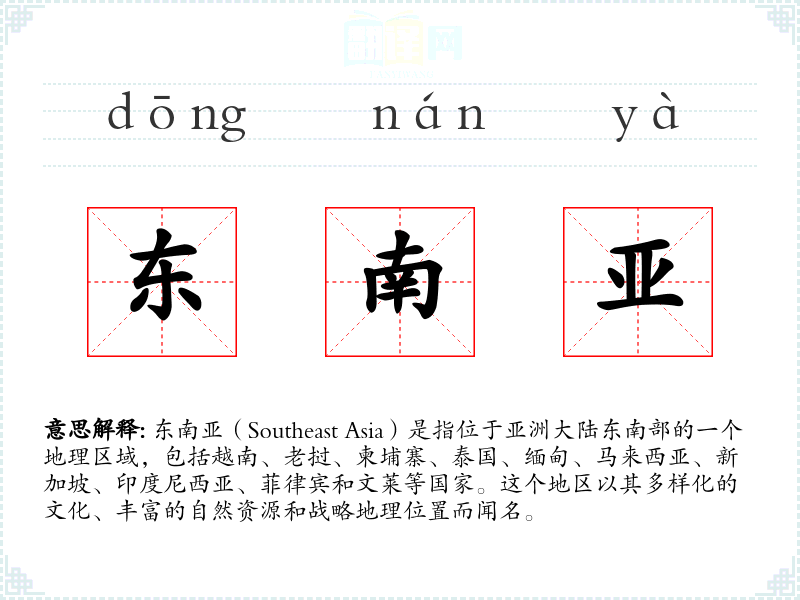 - 反义词:中亚、北亚(这些地区与东南亚在地理位置和文化特征上有显著差异)