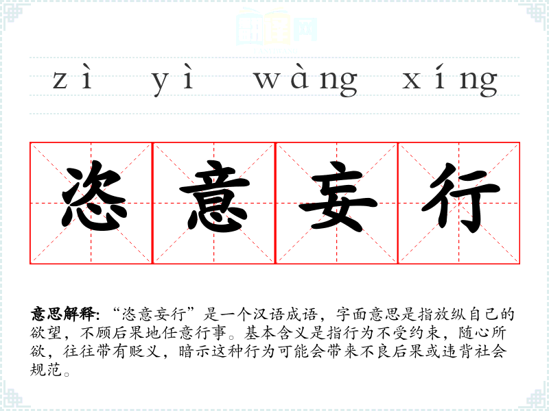 “恣意妄行”是一个汉语成语,字面意思是指放纵自己的欲望,不顾后果地任意行事。基本含义是指行为不受约束,随心所欲,往往带有贬义,暗示这种行为可能会带来不良后果或违背社会规范。