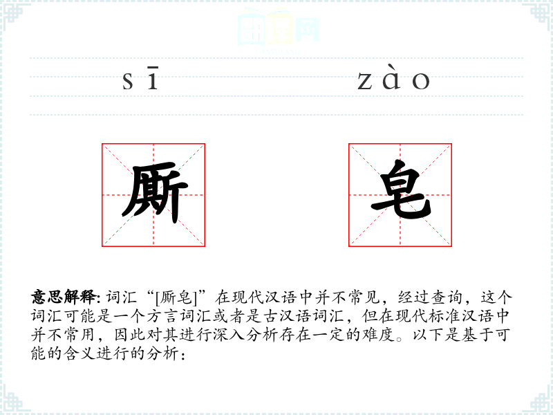 词汇“[厮皂]”在现代汉语中并不常见,经过查询,这个词汇可能是一个方言词汇或者是古汉语词汇,但在现代标准汉语中并不常用,因此对其进行深入分析存在一定的难度。以下是基于可能的含义进行的分析: